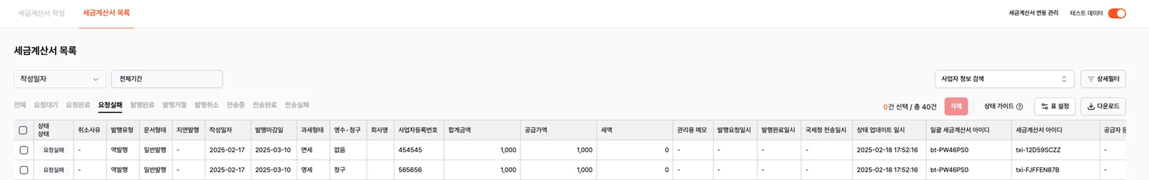 - 세금계산서 > 세금계산서 목록 > 요청실패